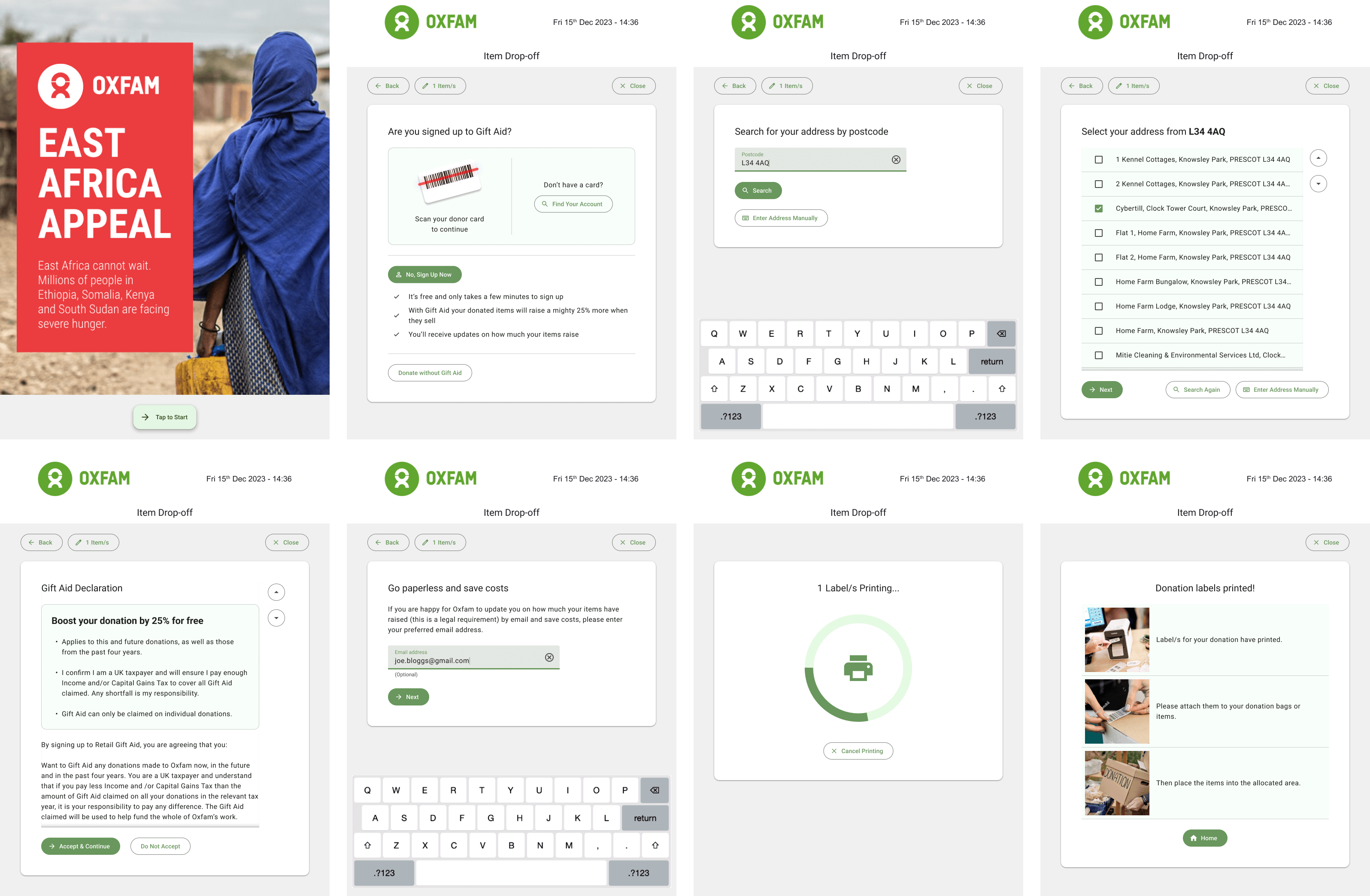 The Bag Drop app and overall Donor Station UI went through extensive wireframing and iterations, informed by feedback from colleagues and customers. Once finalised, the designs were prototyped in Material Design, ensuring a consistent and modern look. These prototypes served as the foundation for development, helping streamline the build process.